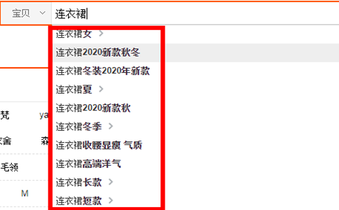 ②、还可以在淘宝的搜索栏里输入自己经营的产品,比如羽绒服,淘宝搜索就会显示出一列的下拉词,这些下拉词也是目前行业里比较火的搜索词,我们在写标题时也可以参考自己宝贝的标题中有没有包含这些词。