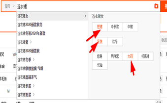 属性词找的好,能提高精准搜索流量。还是老样子输入产品关键词到淘宝搜索栏,在出现的下拉词中会有一些词后面跟着>符号。点击符号就会出现这个产品的一系列属性,这就属于属性词,然后带有红色字样的就是消费者搜索热词,也是系统主推词,我们在自己的产品中也可以加上这些词。
