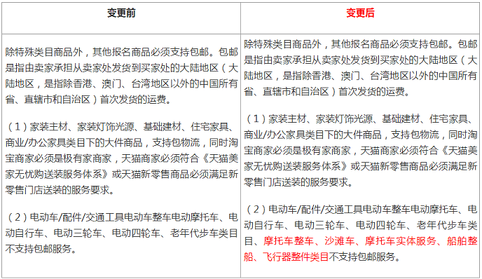 各位亲爱的会员: 因部分特殊品类的商品有特殊的运输方式等原因,我们将针对营销平台的包邮规则进行调整。新增摩托车整车、沙滩车、摩托车实体服务、船舶整船、飞行器整件类目不支持包邮服务。 本次规则调整于2018年11月30日正式生效。 详细变更点:......