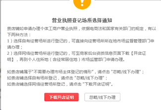 (2)选择网络经营场所进行登记的,可至商家后台资质信息页面下载【开店证明】,再到个人住所地市场监管部门申请办理。