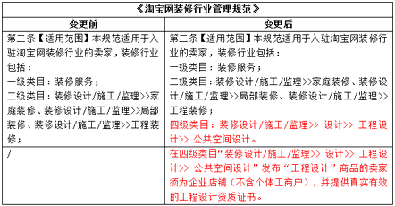 主要变更内容:明确装修行业发布“工程设计”商品的卖家准入要求。